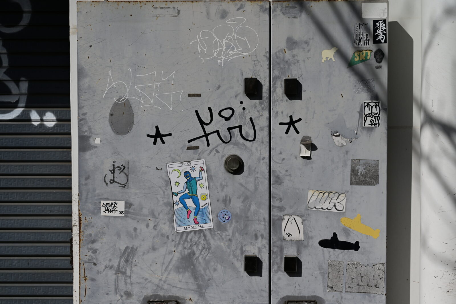 右上の「飛車」のようなステッカーは割とどこにでも貼られている。